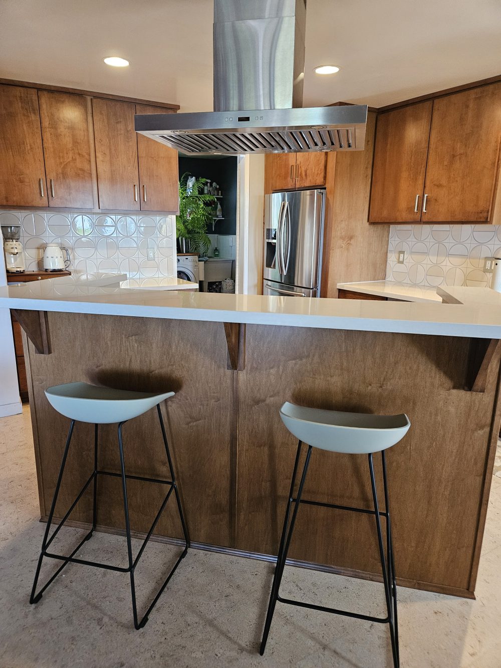 Maple Espresso refacing Quartz countertops, awaiting splash.